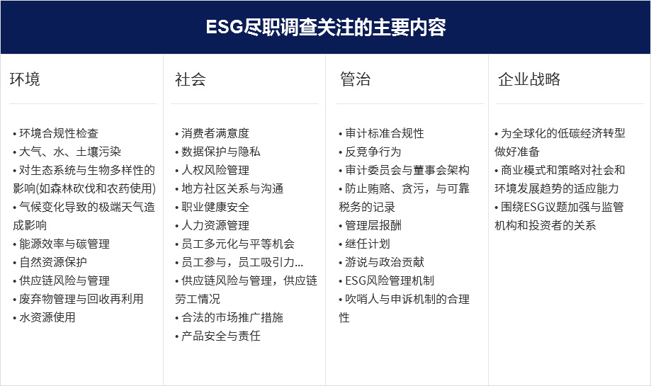 通过文件审阅、实地审核和评估、ESG数据信息的收集,具体了解目标企业环境、社会与企业管治现状,识别和分析可能影响上市企业估值或声誉的关键运营活动带来的潜在风险、影响、责任和机遇,按照其重要性、严重性优先排序,并提出一般性补救措施及改善建议。