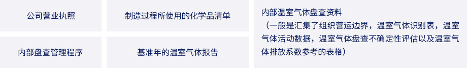 由外部认证公司安排查证计划并实施查证,要求提供公司营业执照,制造过程所使用的化学品清单,内部温室气体盘查资料(一般是汇集了组织营运边界,温室气体识别表,温室气体活动数据,温室气体盘查不确定性评估以及温室气体排放系数参考的表格),内部盘查管理程序,基准年的温室气体报告等认证公司要求的文件。然后,认证公司审核员会到公司进行现场确认温室气体的识别并查证文件。